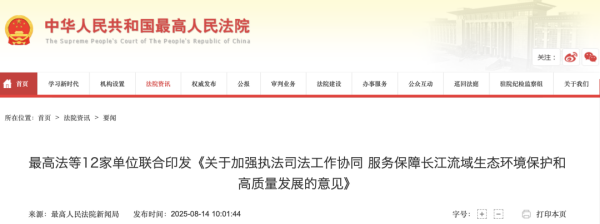 8月15是全国生态日,******人民法院、******人民检察院、******发展改革委、公安部、司法部、自然资源部、生态环境部、水利部、农业农村部、文化和旅游部、******林草局、******文物局等12家中央和******机关联合印发《关于加强执法司法工作协同 服务保障长江流域生态环境保护和高质量发展的意见》: