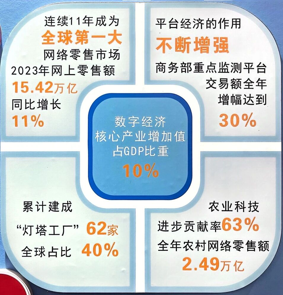 ******数据局正式发布《数字中国发展报告(2023年)》全文。我国数字经济核心产业增加值占GDP比重10%左右。累计建成62家“灯塔工厂”,占全球总数的40%。连续11年成为全球******大网络零售市场。