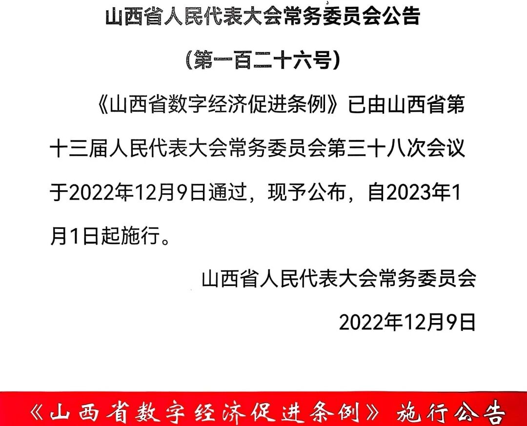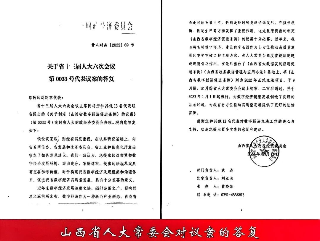 新东团队2022年1月,在山西省十三届六次会议上提出关于制定《山西省数字经济促进条例》0033编号的议案。被大会议案审查委员会及主席团通过,并于同年制定完毕,该条例于2023年1月1日颁布施行,自此,山西发展数字经济有了地方性法治保障。