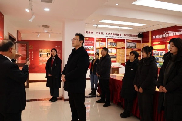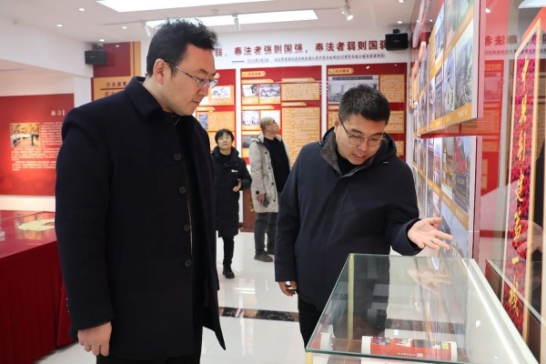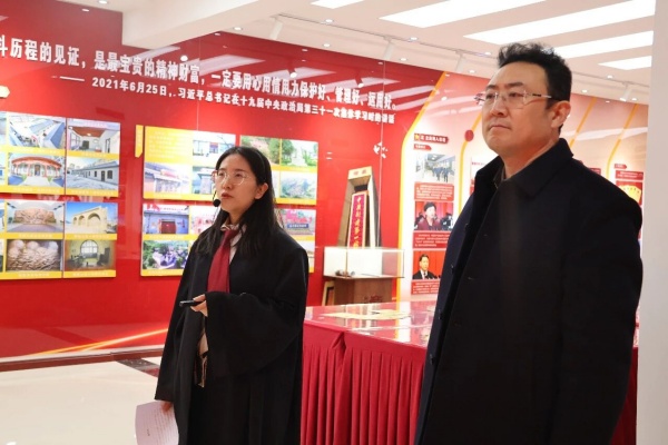 调研组一行首先参观了设立于我所的阳泉市红色教育基地、党史教育基地——“红色党建 法治护航”展厅,刘新东主任介绍了我所红色立法、红色展厅、红色行动与律师业务互促互进取得的成效;讲解员梁美琪详细介绍了关于展厅的建设初衷、功能与内容,让调研人员深刻感受了我市红色文化的历史积淀和我所在红色文化保护传承方面所做的努力,让我所红色展厅成为一片闪耀着光辉的红色阵地。