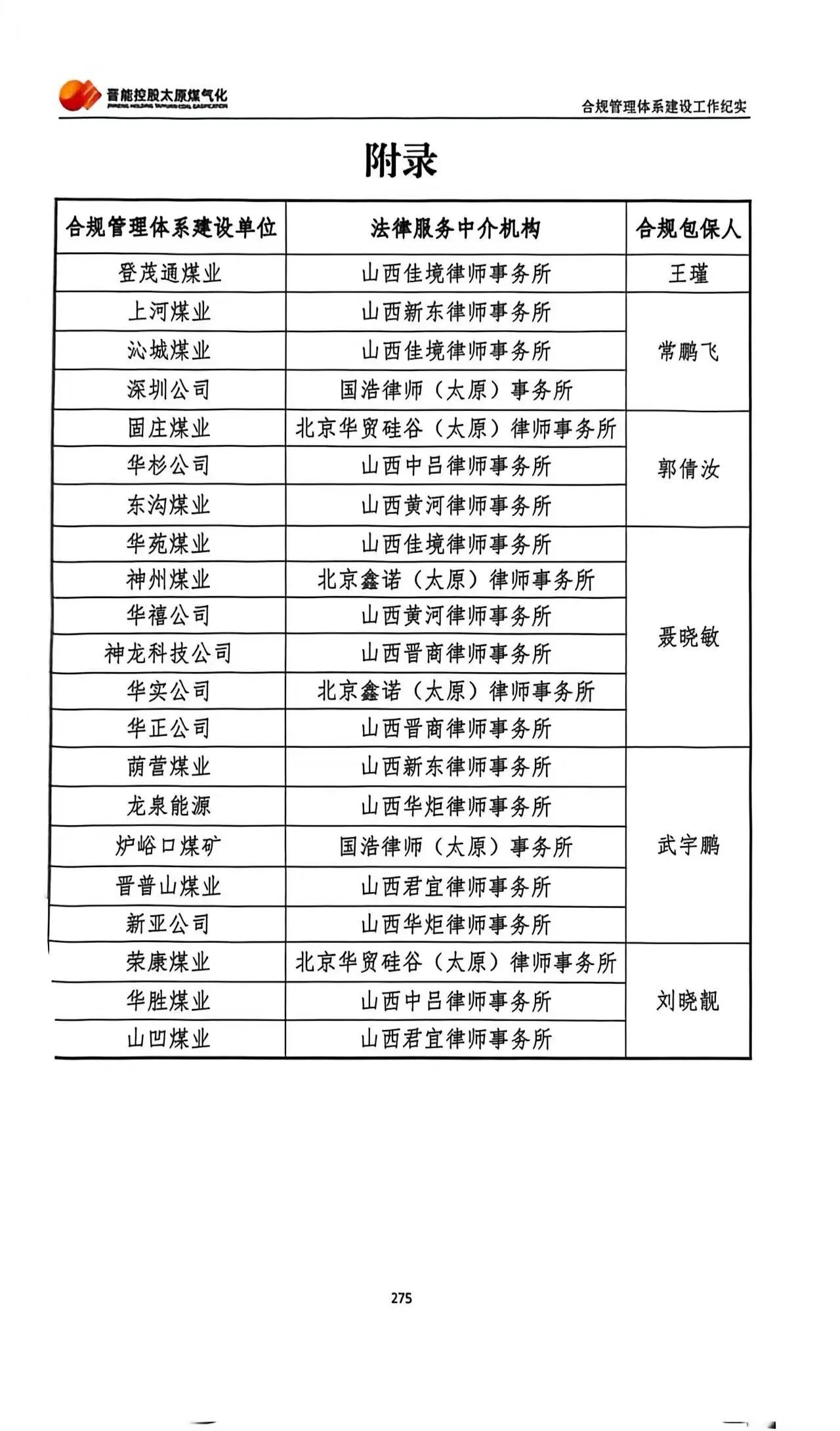 在晋能控股太原煤碳气化合规管理服务团队中,山西新东律师事务所和山西新东(太原)律师事务所联动,成功承接荫营煤业、上河煤业合规管理体系建设全流程工作,项目成果被收录至工作纪实,成为企业合规建设的典型实践。