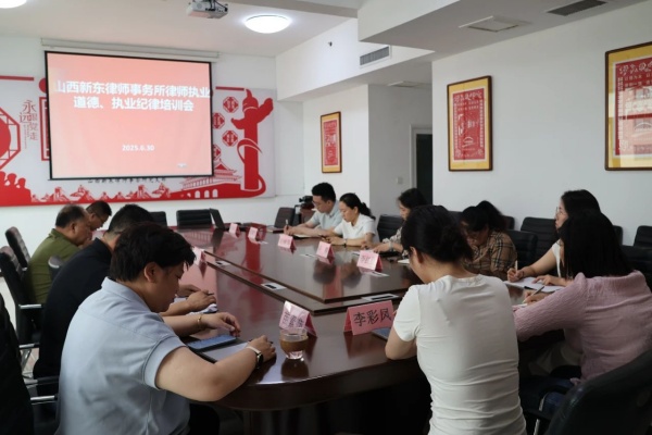 为深化律师队伍建设,筑牢职业道德根基,强化职业纪律意识,山西新东律师事务所于6月30日上午在所会议室召开了律所职业道德、职业纪律培训会。本次培训会由所党支部书记郝俊修主持,主任刘新东、副主任赵仲琴及律所其他成员参加。
